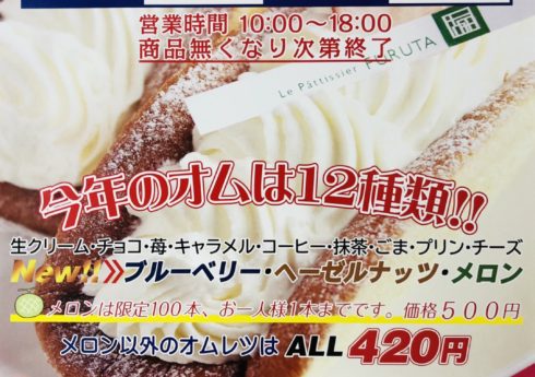 報告!オムの日!海の日15日!新作3品!ブルーベリー、ヘーゼルナッツ、メロン!メロンは100本限定でお一人様1点限り!毎年行列ができるイベントなので日傘や飲み物用意してきて下さい!一年で一度のオムレツが並ぶのでオムファン