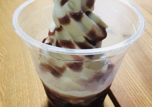 冷んやりしるこソフトです!大好評販売中です!下から、おしるこ、お餅、葛きり、かのこ豆をin!ソフトを巻いてあんこをかけたら出来上がり!あんまりインスタ映えしないですけど味はバッチリ!600円!お待ちしております!